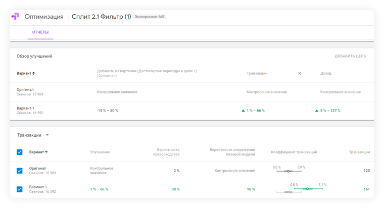 (Оценка фактического прироста происходит в Google Optimize)